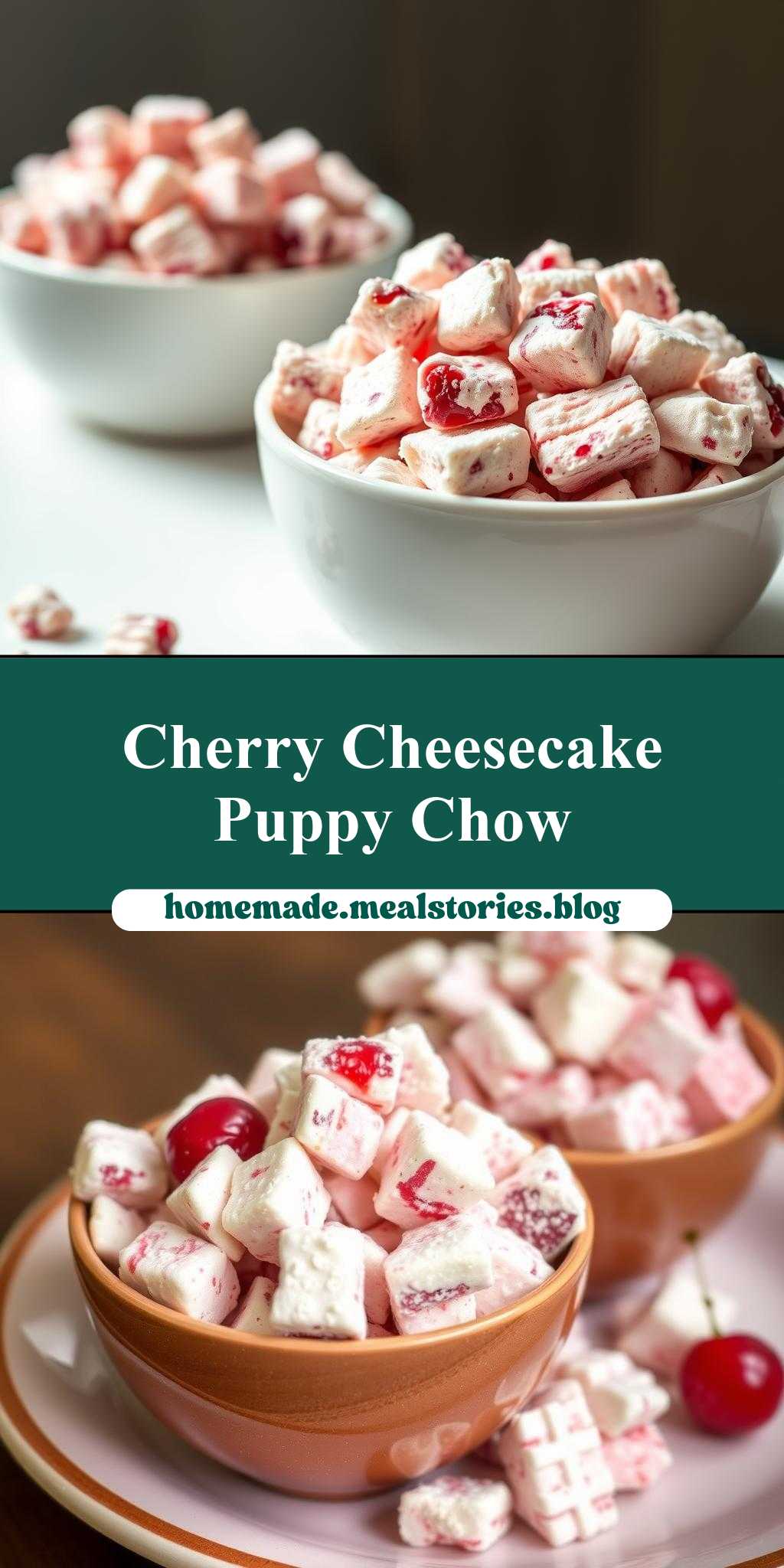 A no-bake dessert combining the richness of cheesecake with the fruity allure of cherries, mixed into a delightful puppy chow.